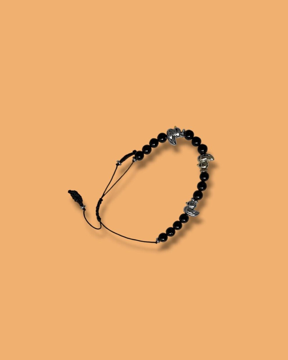 Браслет на шнуре регулируемый из бусин черного агата и уточками из латуни