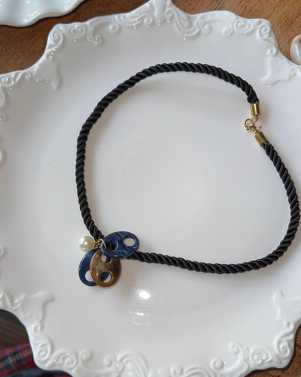 Чокер на чером атласном шнуре с подвесками- коннекторам и бусиной под жемчуг