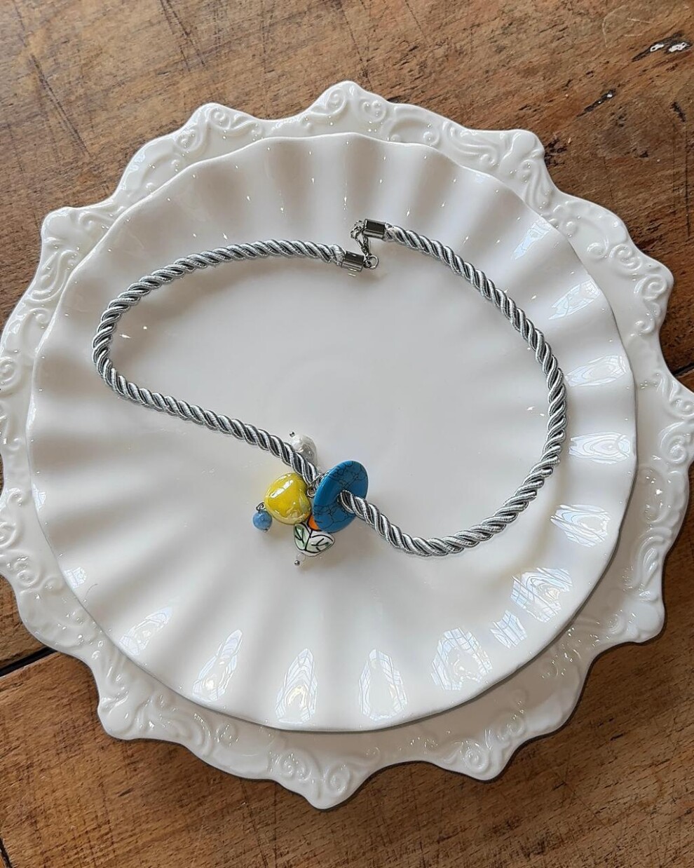 Чокер на сером атласном шнуре с декором-бубликом голубым из кварцевого агата, с подвесками из керамического желтого сердца, керамического тюльпана и бусин натурального жемчуга на съемном круглом карабине