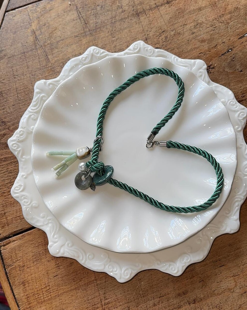 Чокер на зеленом атласном шнуре с малым бубликом из серого лабрадорита и бусинами, с большим бубликом кварцевого агата и съемной подвеской на карабине-сердце с бусинами-трубочками из агата