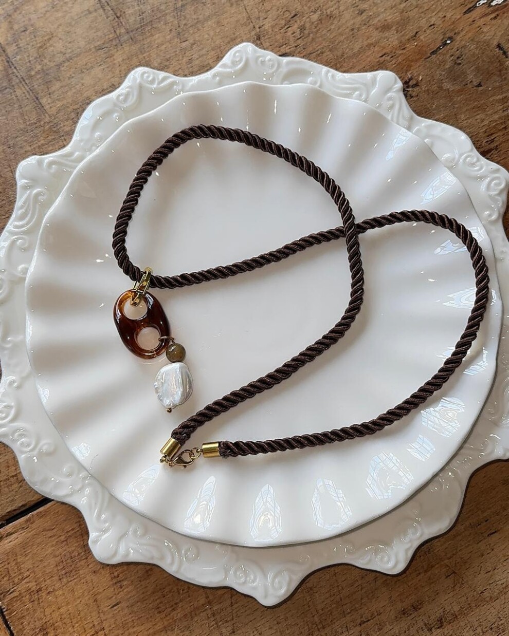 Длинное колье из коричневого атласного шнура и подвеской на карабине из коннектора , бусины яшмы и крупной жемчужины