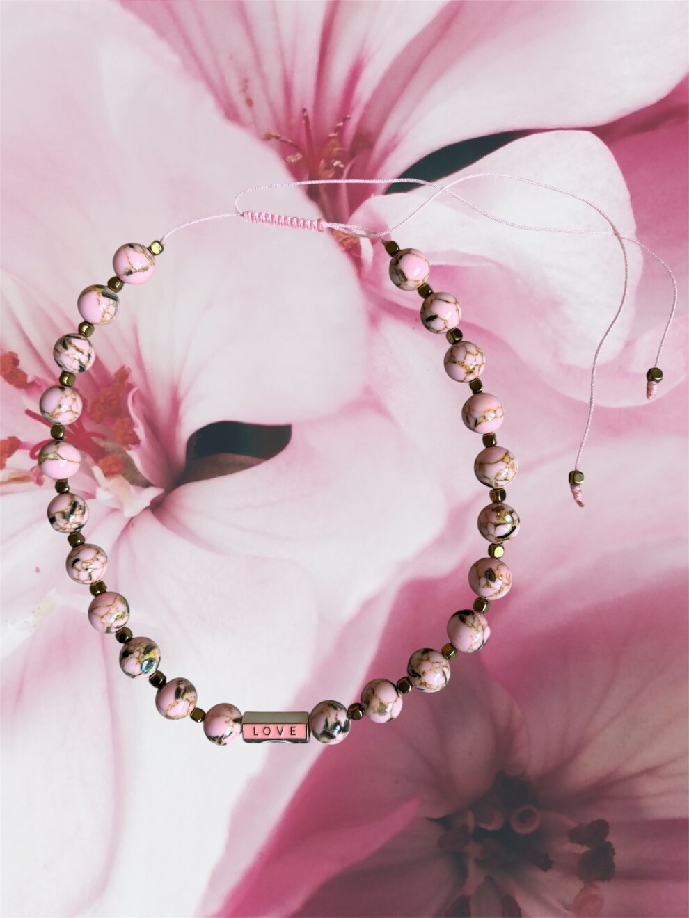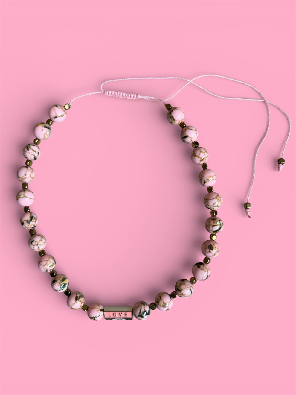 Колье на шнуре с удлинением из розового говлита с ракушкой , золотого гематита и декором-трубочкой из латуни с эмалью LOVE