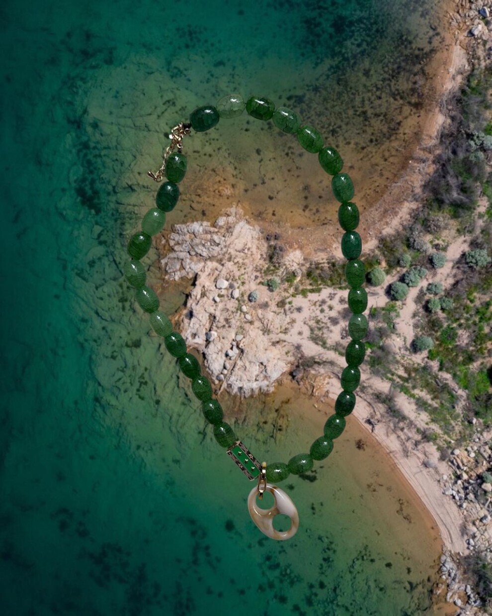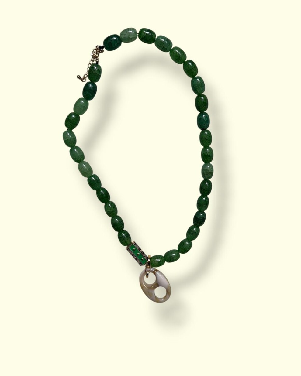 Колье-чокер из зеленых стеклянных сахарных бочонков с декоративным элементом (латунь с цветным покрытием эмаль) и с подвеской на карабине