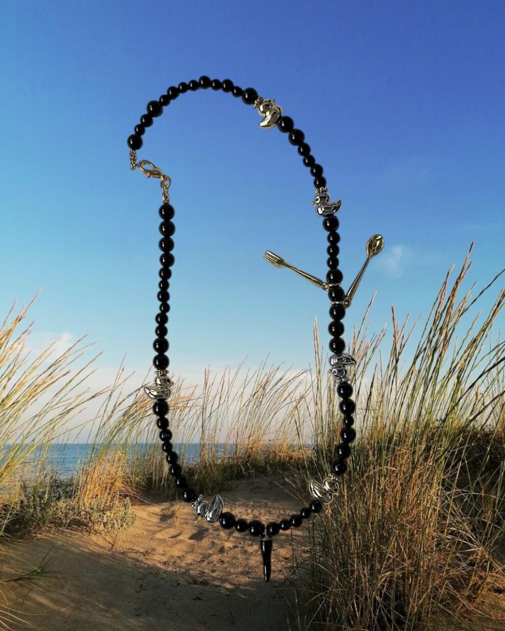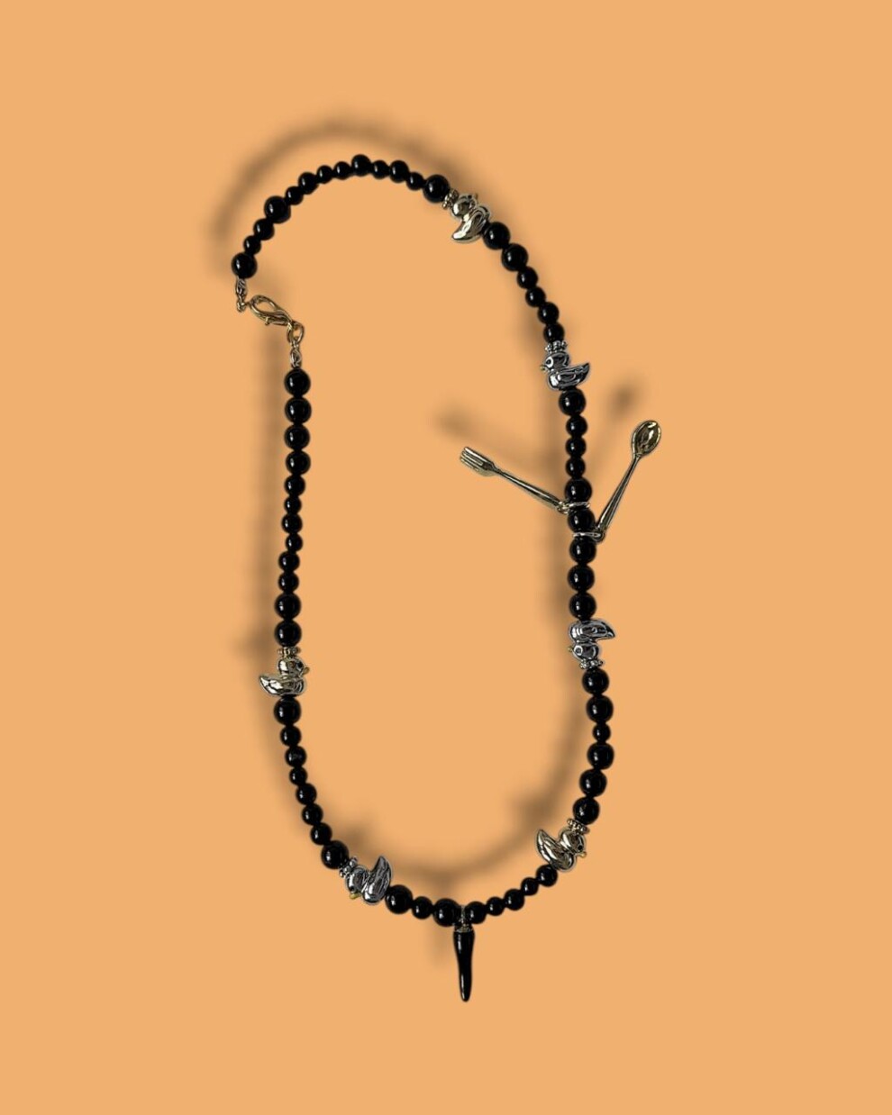 Колье из бусин черного агата с уточками из латуни и подвесками ложка и вилка