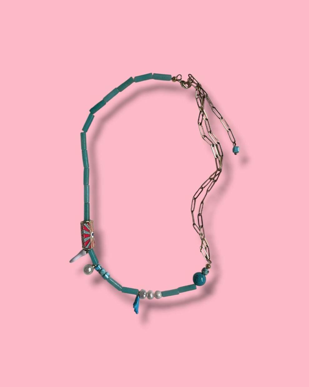 Колье из трубочек голубого агата с декоративным элементом (латунь с цветным покрытием эмаль), с бусинами жемчуга и африканской бирюзы и цепи с удлинением