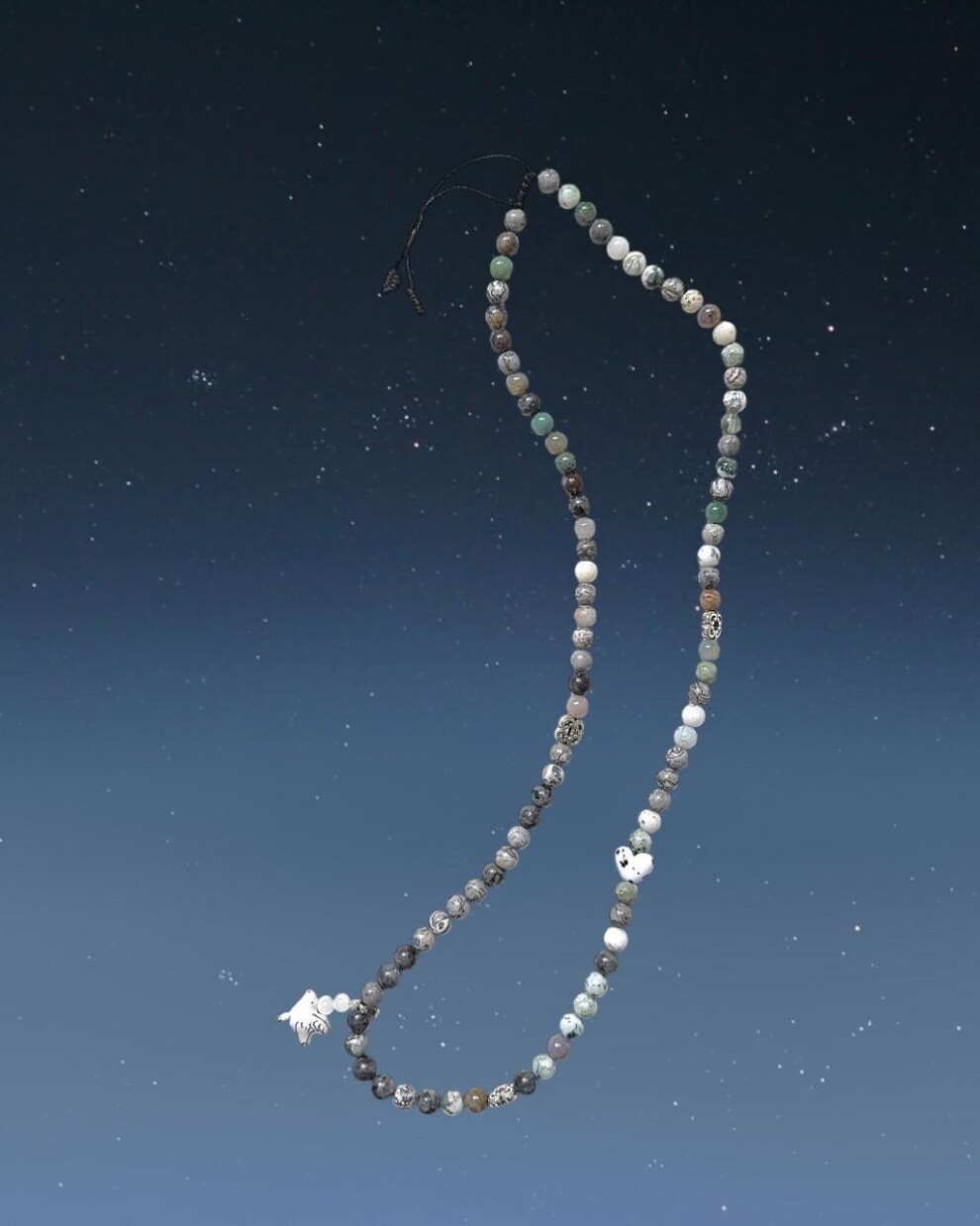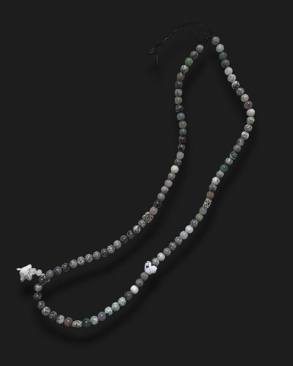 Длинное ожерелье на шнуре ( с регулируемой длиной) с камнями индийской яшмы, серой яшмы и мохового агата, с декоративным элементом из латуни и съемной подвеской с керамической голубкой