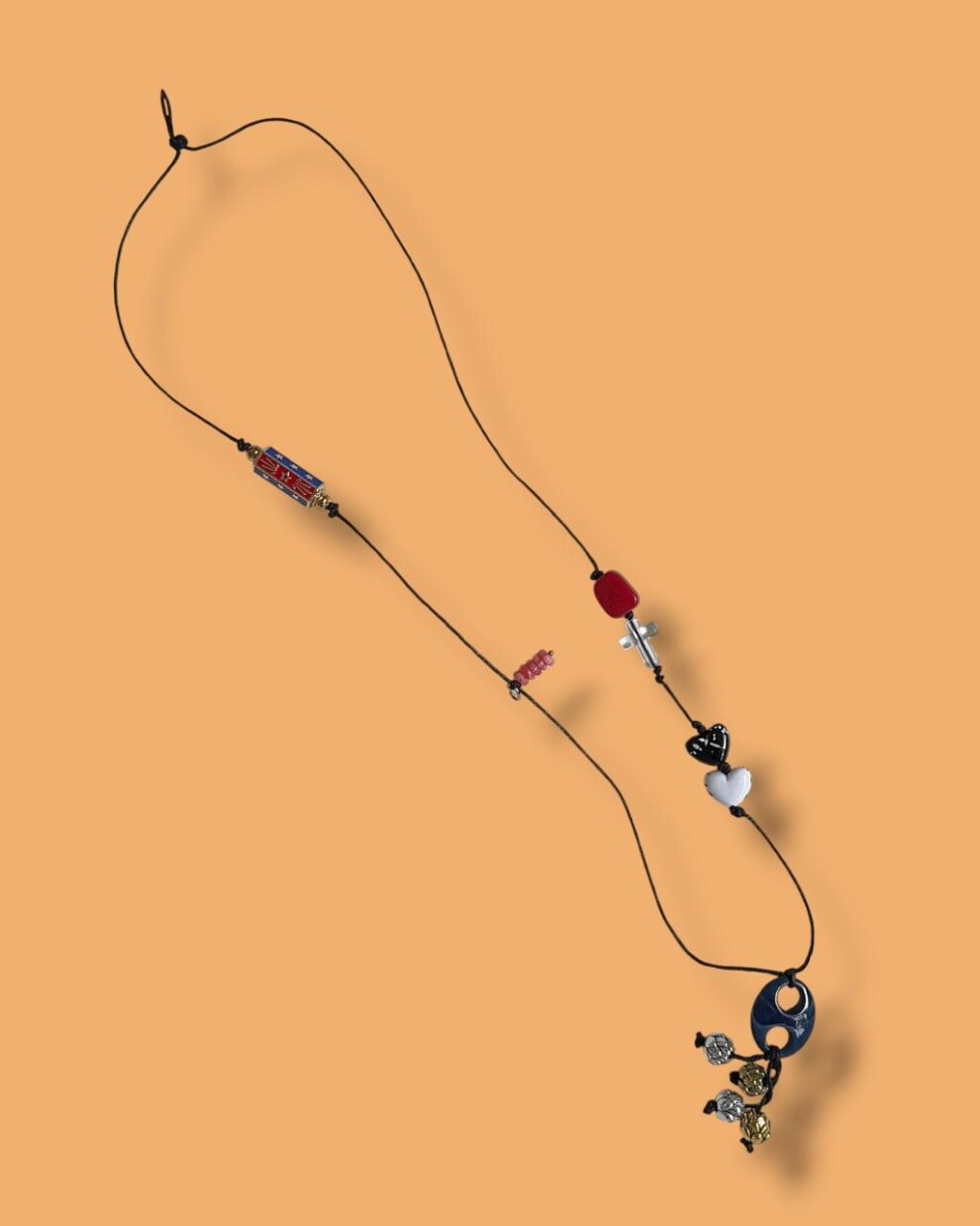 Длинное колье на черном вощеном шнуре с декоративными элементами на узлах : подвеска на пине из розового кварца, прозрачный акриловый крест, сердца - черное и белое, элементы из латуни с цветным покрытием , подвеска-коннектор и бусины-артишоки из латуни