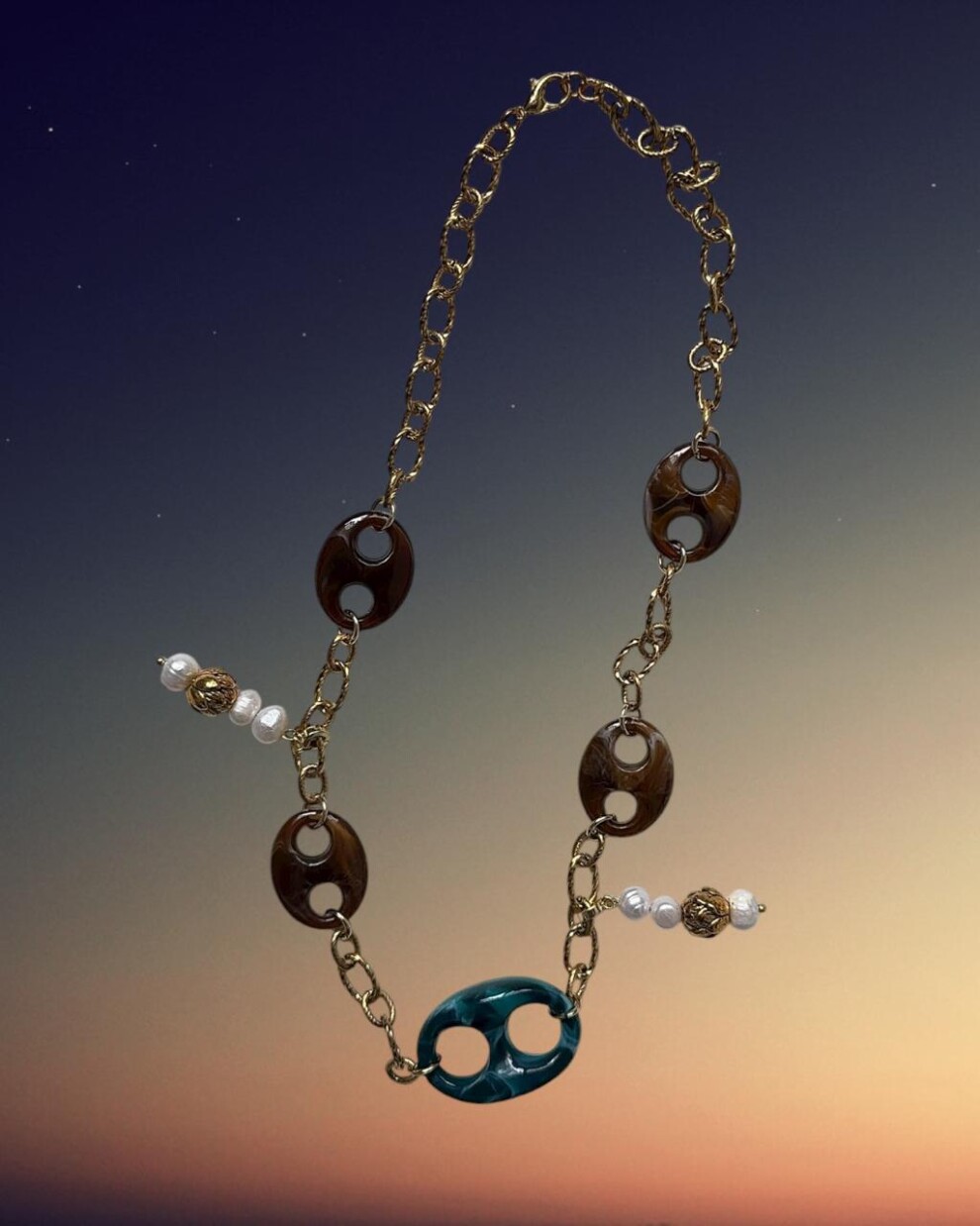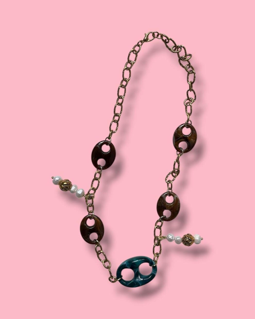 Колье из цепи (сталь с золотым покрытием) и коннекторами из акрила и съемными подвесками из жемчуга и артишока (латунь)