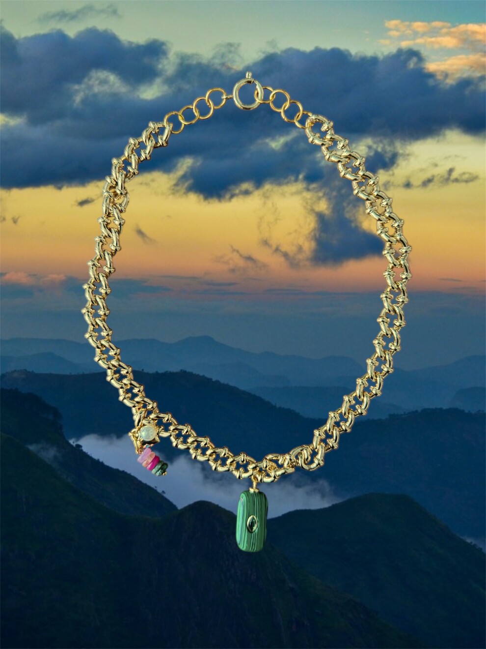 Колье из цепи Берлин с подвеской из малахита и съемным комплектом подвесок из натурального камня