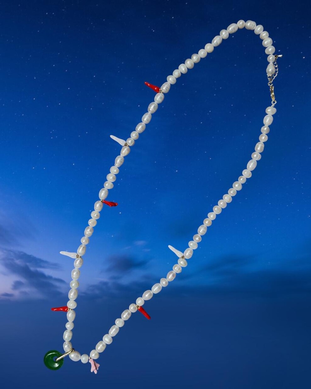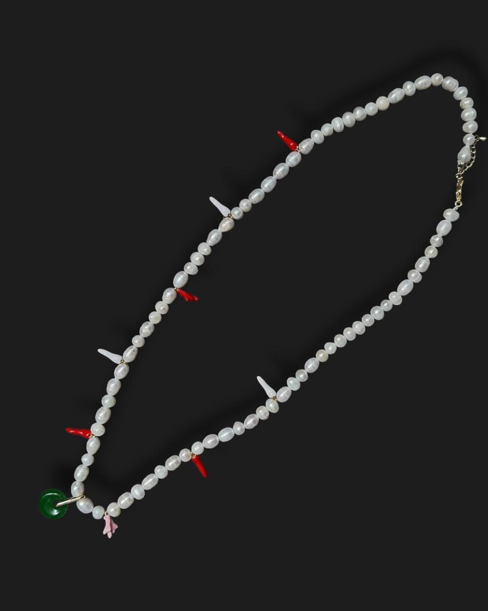 Длинное ожерелье из натурального жемчуга с подвеской-бубликом из зеленого кварцевого агата на карабине и с декором